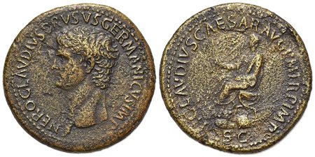 Claudius (41-54), Sestertius, Rome, 42-3. AE (g 28,02; mm 34,5; h 6). NERO CLAVDIVS DRVSVS GERMANICVS IMP, Bare head l.; Rv. TI CLAVDIVS CAESAR AVG P M TR P IMP, Claudius seated l. on curule chair, holding branch and resting hand