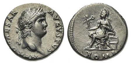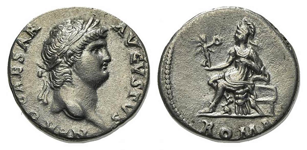Nero (54-68), Denarius, Rome, c. 64-5. AR (g 3,30; mm 17; h 6). NERO CAESAR AVGVSTVS, Laureate head r.; Rv. Roma seated l. on cuirass, holding Victory and parazonium, foot on helmet; ROMA in exergue. RIC 55; RSC 258. Good very fine