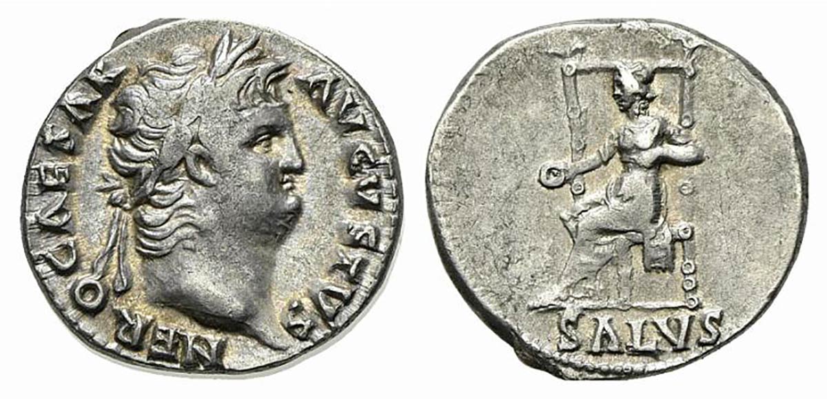Nero (54-68), Denarius, Rome, c. 65-6. AR (g 3,50; mm 17; h 6). IMP NERO CAESAR AVGVSTVS, Laureate head r.; Rv. SALVS, Salus seated l. on ornamented throne, holding patera. RIC 60; RSC 314. Very fine - good very fine