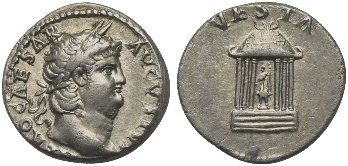 Nero (54-68), Denarius, Rome, ca. 65-6. AR (g 2,82; mm 18; h 6). NERO CAESAR AVGVSTVS, Laureate head r., Rv. Hexastyle temple of Vesta with domed roof, set on podium of four steps; within, statue of Vesta seated l., holding patera and sceptre; VESTA above. RIC 62; RSC 335. Near extremely fine