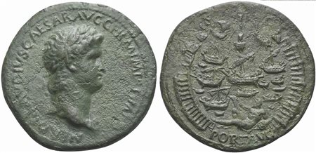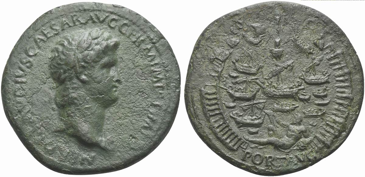 Nero (54-68), Sestertius, Rome, AD 64. AE (g 22,50; mm 37; h 7). NERO CLAVDIVS CAESAR AVG GERM P M TR P IMP P P, Laureate head r., Rv. […]PORT AVG, Port of Ostia: seven ships within the harbor; at the top is a pharus surmounted by a statue of Neptune; below is a reclining figure of Tiber, holding a rudder in r. hand and dolphin in l.; to l., crescent-shaped pier with portico, terminating with figure sacrificing at altar and with building; to r., crescent-shaped row of breakwaters or slips. Cf. RIC 183. Green patina, very fine - good very fine