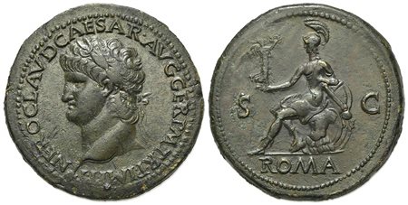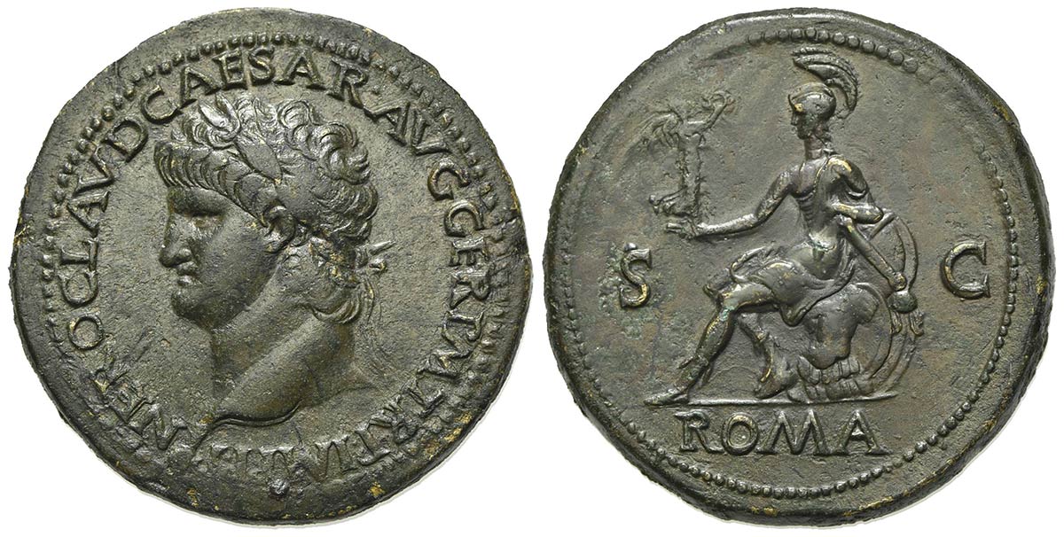Nero (54-68), Sestertius, Rome, ca. AD 65. AE (29.76 g, mm 36, h 6). NERO CLAVD CAESAR AVG GER P M TR P IMP P P, Laureate head l.; Rv. Roma seated left on cuirass, holding Victory and parazonium, foot on helmet; shields behind; ROMA. RIC 274. Smoothed, green patina, good very fine