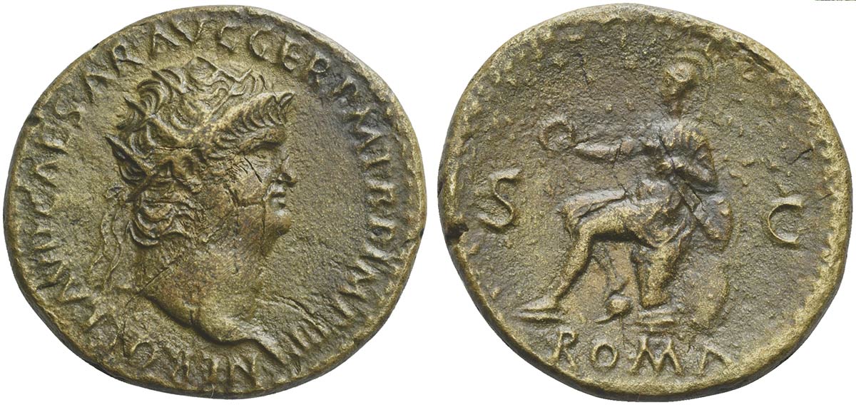 Nero (54-68), Dupondius, Rome, AD 65. AE (g 13,66; mm 29; h 5). NERO CLAVD CAESAR AVG GER P M TR P IMP P P, Radiate head r., Rv. ROMA, Roma seated l. on cuirass, r. foot on helmet, holding wreath and parazonium; round shields behi