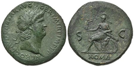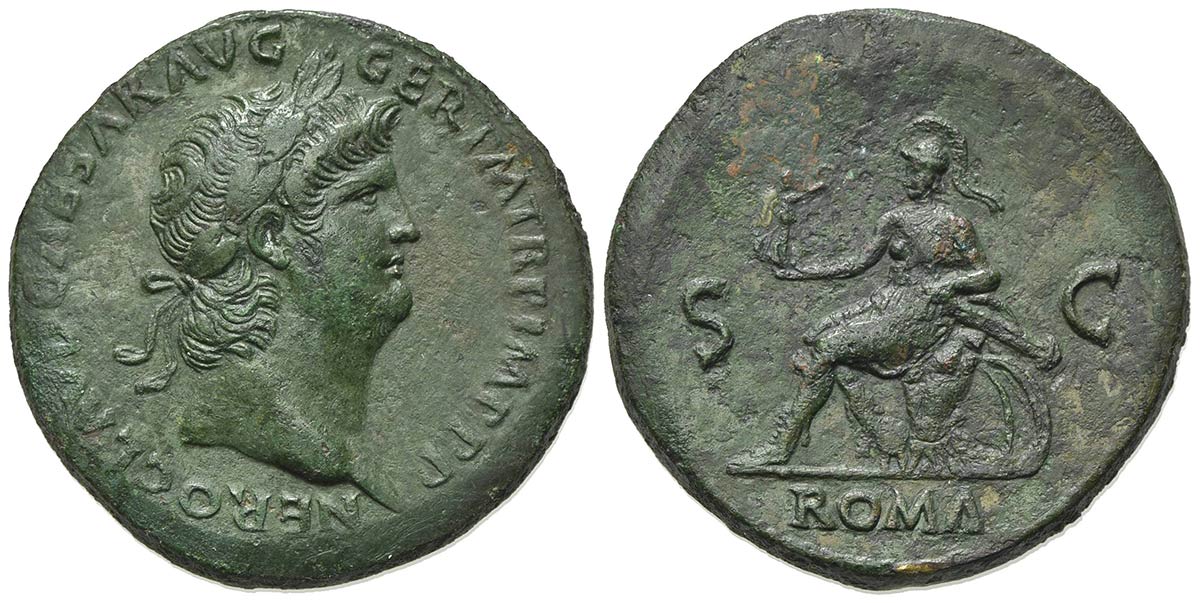 Nero (54-68), Sestertius, Rome, AD 66. AE (29.71 g, mm 36, h 6). NERO CLAVD CAESAR AVG GER IM TR P IMP P P, Laureate head r.; Rv. Roma seated l. on cuirass, holding Victory and parazonium; shields behind; ROMA. RIC 329. Green patina, good very fine