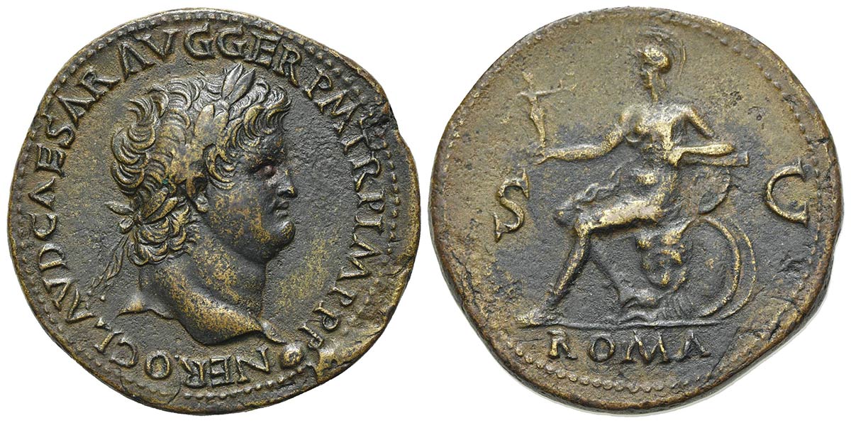 Nero (54-68), Sestertius, Lugdunum, c. AD 65. AE (g 24.93; mm 35; h 6). NERO CLAVD CAESAR AVG GER P M TR P IMP P P, Laureate head r., globe at point of neck; Rv. Roma seated l. on cuirass, holding Victory and resting hand on parazonium, foot on helmet; shields to r.; ROMA in exergue. RIC 442. Good very fine
