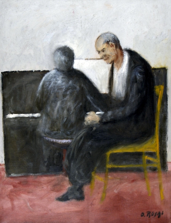 "Pianista e uomo seduto" Olio su tela cm. H: 65.00 L: 50.00 Firma in bassoa destra. Etichetta al retro del ritrovamento nello studio du O. Rosai in data 31/5/1957. Pubblicato su "Ottone Rosai" di Luigi Cavallo, mostra dell'ottobre 1984, catalogo n.25 della Galleria d'Arte Bergamini, Milano.