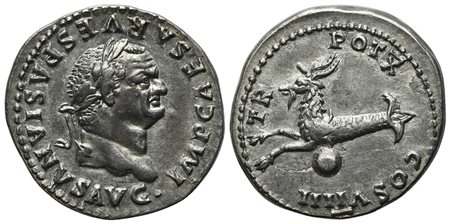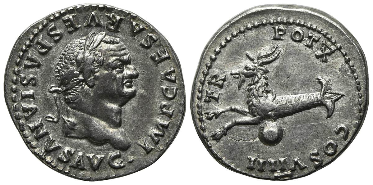 Vespasian (69-79), Denarius, Rome, AD 79. AR (g 3,30; mm 20; h 6). IMP CAESAR VESPASIANVS AVG, Laureate head r.; Rv. TR POT X COS VIIII, Capricorn l.; globe below. RIC 1058; RSC 554. Toned, about extremely fine
