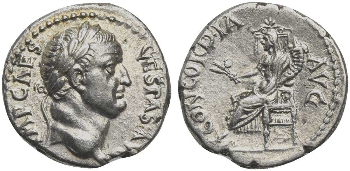 Vespasian (69-79), Denarius, Ephesus, 69-70. AR (g 3,27; mm 17; h 12). IMP CAES VESPAS AVG, Laureate head r., Rv. CONCORDIA AVG, Concordia seated l., on ornate high-backed chair, with corn ears and poppy and cornucopiae. RIC 1394; RPC 804; RSC 65a. Near extremely fine