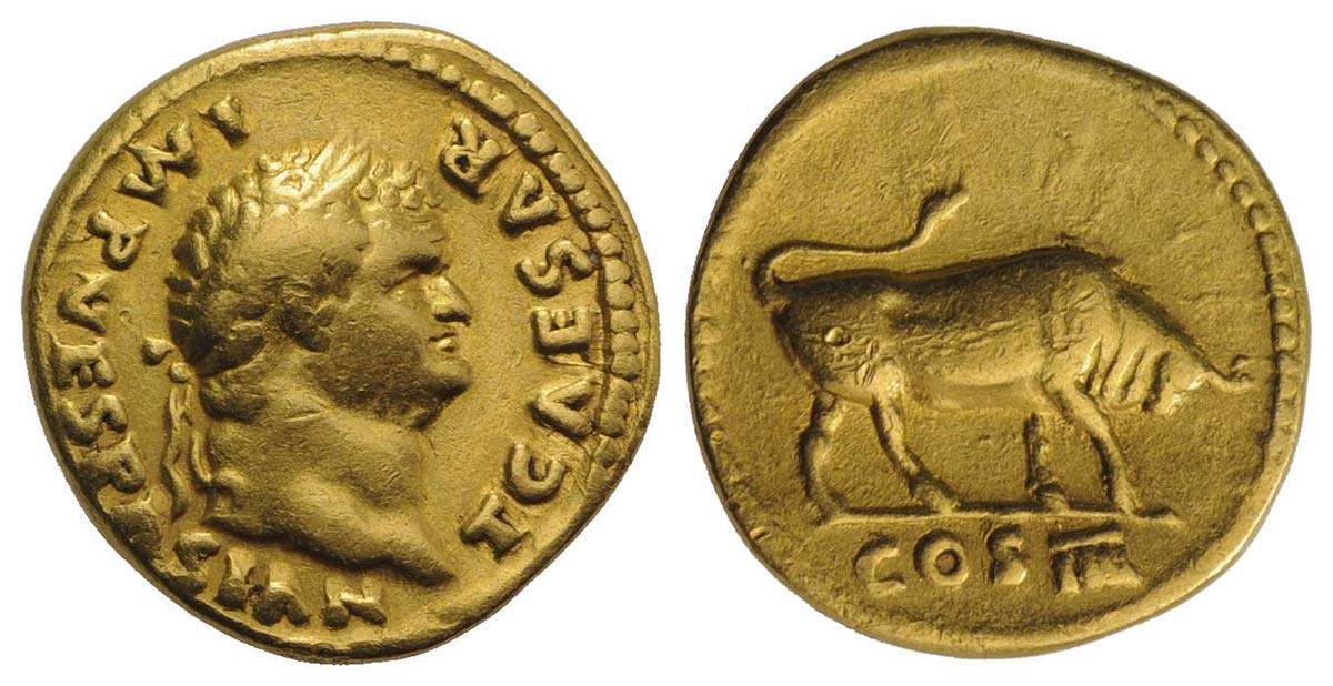 Titus (Caesar, 69-79). AV Aureus (g 7.212, mm 19, h 6). Rome, AD 75. T CAESAR IMP VESPASIAN / COS IIII, Laureate head r.; Rv. Bull charging r. RIC II 780 (Vespasian). Very fine