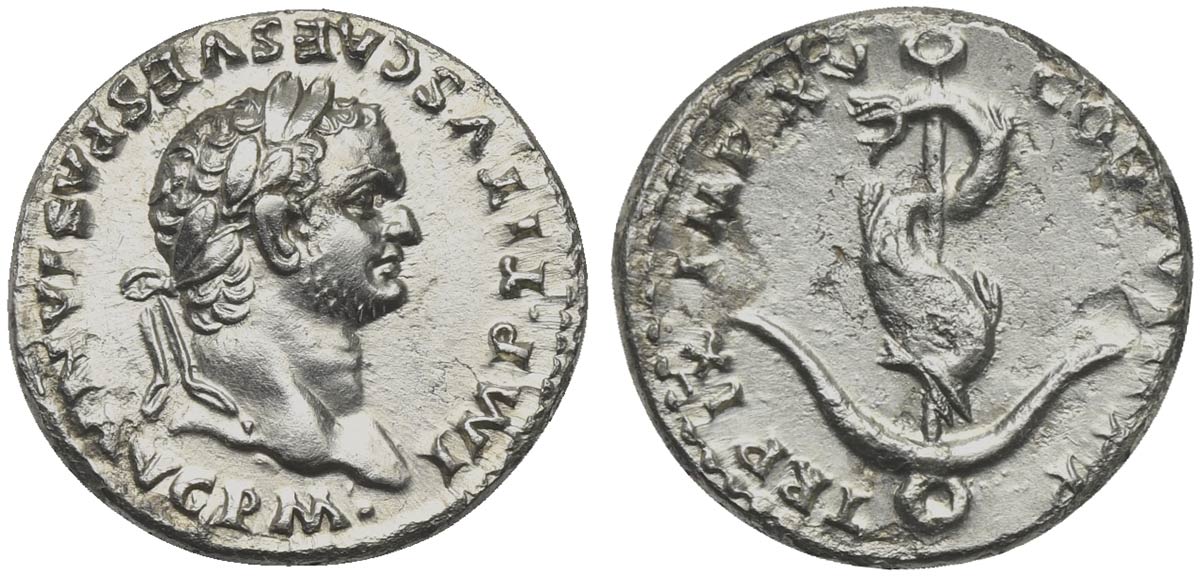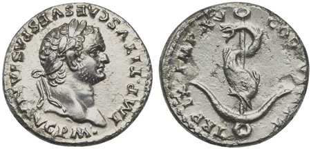 Titus (79-81), Denarius, Rome, 1 January-30 June AD 80. AR (g 3,33; mm 17; h 12). IMP TITVS CAES VESPASIANVS AVG P M, Laureate head r., Rv. TR P IX IMP XV COS VIII P P, Dolphin coiled around anchor. RIC 112; RSC 309. Good very fin