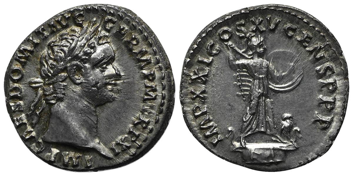 Domitian (81-96), Denarius, Rome, AD 91. AR (g 3,59; mm 18; h 6). IMP CAES DOMIT AVG GERM P M TR P XI, Laureate head r.; Rv. IMP XXI COS XV CENS P P P, Minerva advancing r. on galley, holding spear and shield; owl at feet. RIC 725