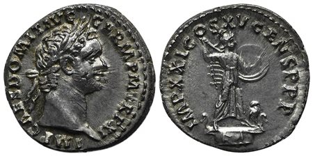 Domitian (81-96), Denarius, Rome, AD 91. AR (g 3,59; mm 18; h 6). IMP CAES DOMIT AVG GERM P M TR P XI, Laureate head r.; Rv. IMP XXI COS XV CENS P P P, Minerva advancing r. on galley, holding spear and shield; owl at feet. RIC 725; RSC 270. Good very fine