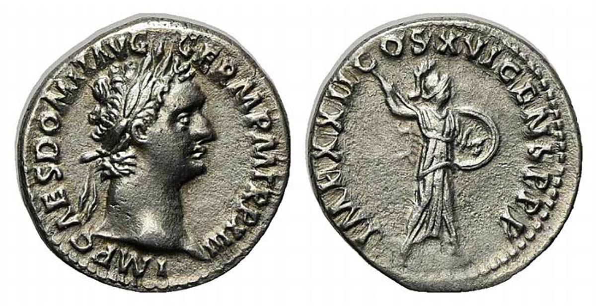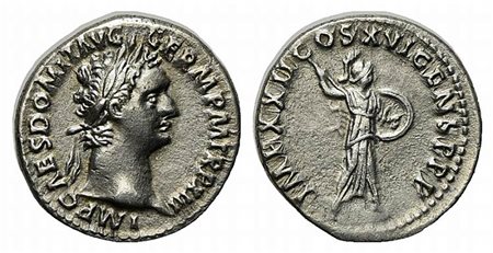 Domitian (81-96), Denarius, Rome, 93-4. AR (g 3,13; mm 18; h 6). IMP CAES DOMIT AVG GERM P M TR P XIII, Laureate head r.; Rv. IMP XXII COS XVI CENS P P P, Minerva advancing r., holding spear and shield. RIC 761; RSC 283b. Toned, near extremely fine