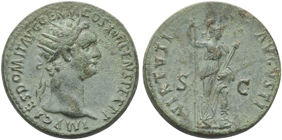 Domitian (81-96), Dupondius, Rome, 95-6. AE (g 14,85; mm 27; h 5). IMP CAES DOMIT AVG GERM COS XVII CENS PER P P, Radiate head r., Rv. VIRTVTI AVGVSTI, Virtus standing r., l. foot set on helmet, holding spear and parazonium, S - C