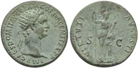 Domitian (81-96), Dupondius, Rome, 95-6. AE (g 14,85; mm 27; h 5). IMP CAES DOMIT AVG GERM COS XVII CENS PER P P, Radiate head r., Rv. VIRTVTI AVGVSTI, Virtus standing r., l. foot set on helmet, holding spear and parazonium, S - C. RIC 804. Green patina, very fine - good very fine