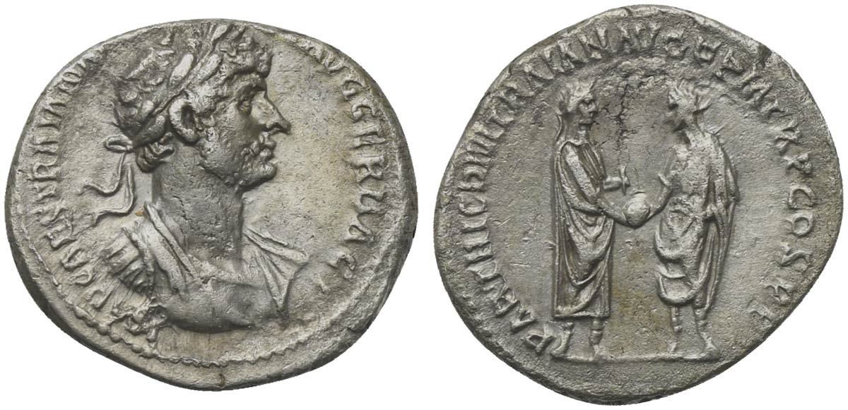Hadrian (117-138), Denarius, Rome, AD 117. AR (g 3,36; mm 19; h 7). IMP CAES TRAIAN HA[…] AVG GER DAC, Laureate, draped and cuirassed bust r., Rv. PARTHIC DIVI TRAIAN AVG F P M TR P COS P P, Trajan and Hadrian standing vis-à-vis,