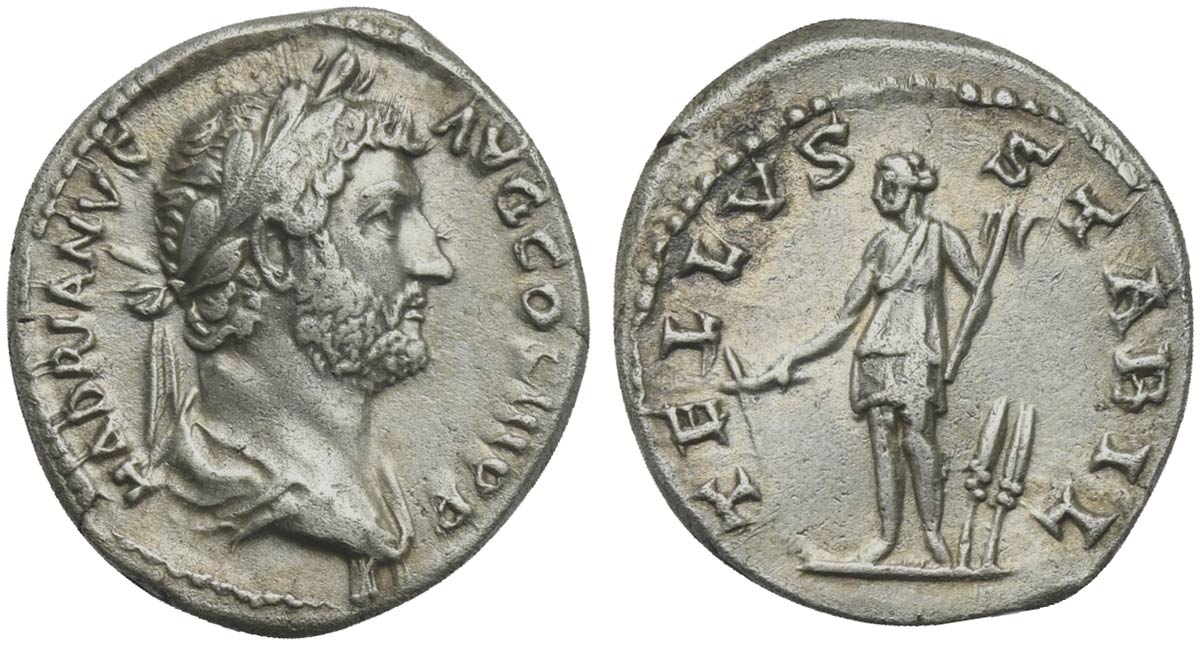 Lotto 1247 | Hadrian (117-138), Denarius, Rome, 134-8. AR ( g 3,39; mm 18; h 7). HADRIANVS AVG COS III P P, Laureate and draped bust r., Rv. TELLVS STABIL, Tellus standing l., holding plow and rake; two grain ears to r. RIC 276; RSC 1427b. Goo