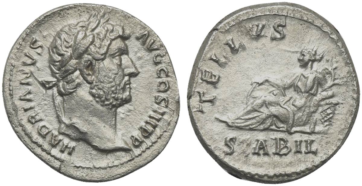 Hadrian (117-138), Denarius, Rome, 134-8. AR ( g 3,48; mm 18; h 7). HADRIANVS AVG COS III P P, Laureate head r., Rv. TELLVS STABIL, Tellus reclining l., resting r. hand on globe and leaning l. arm on basket; vine-branch in l. hand