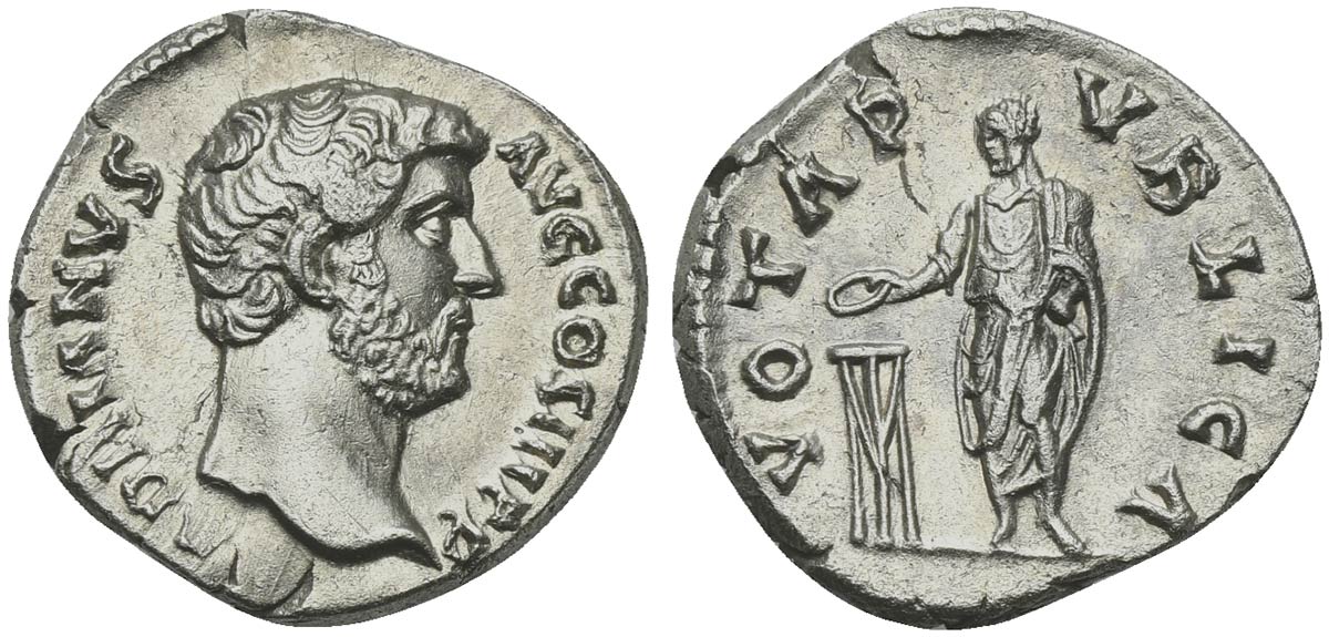 Hadrian (117-138), Denarius, Rome, 134-8. AR (g 3,17; mm 18; h 6). HADRIANVS AVG COS III P P, Bare head r., Rv. VOTA PVBLICA, Hadrian standing l., sacrificing with patera over tripod. RIC 290; RSC 1481. About extremely fine