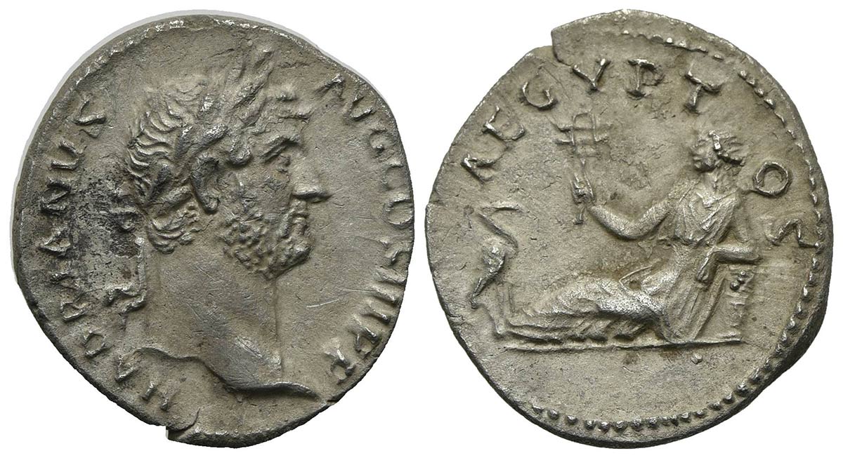 Hadrian (117-138), Denarius, Rome, ca. 134-8. AR (g 3,03; mm 17; h 6). HADRIANVS AVG COS III P P, Laureate head r.; Rv. AEGYPTOS, Egypt reclining l., holding sistrum and resting arm on basket; at feet to l., ibis standing r. RIC 2