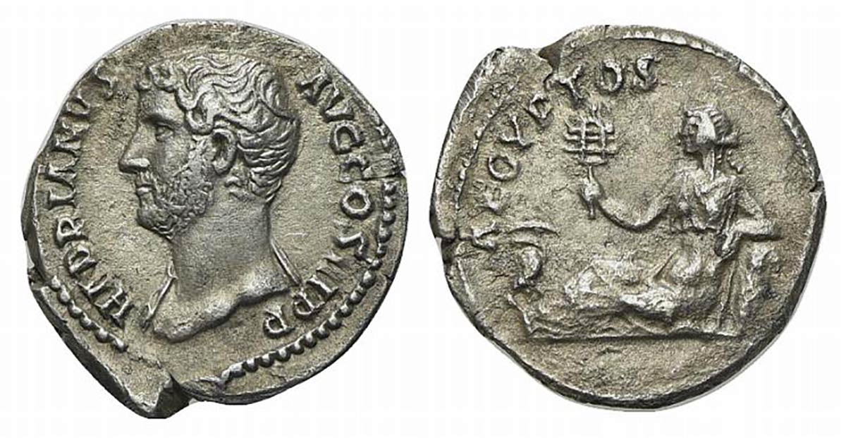 Hadrian (117-138), Denarius, Rome, ca. 134-8. AR (g 2,76; mm 17,5; h 8). HADRIANVS AVG COS III P P, Bare-headed bust l., slight drapery; Rv. AEGYPTOS, Egypt reclining l., holding sistrum and resting arm on basket; at feet to l., i