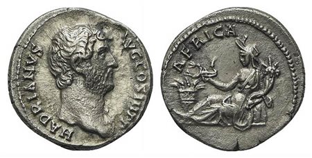 Lotto 1252 | Hadrian (117-138), Denarius, Rome, ca. 134-8. AR (g 3,17; mm 17,5; h 12). HADRIANVS AVG COS III P P, Bare head r.; Rv. AFRICA, Africa reclining l., wearing elephant-skin headdress, holding scorpion and cornucopia; basket of fruit