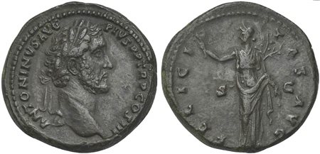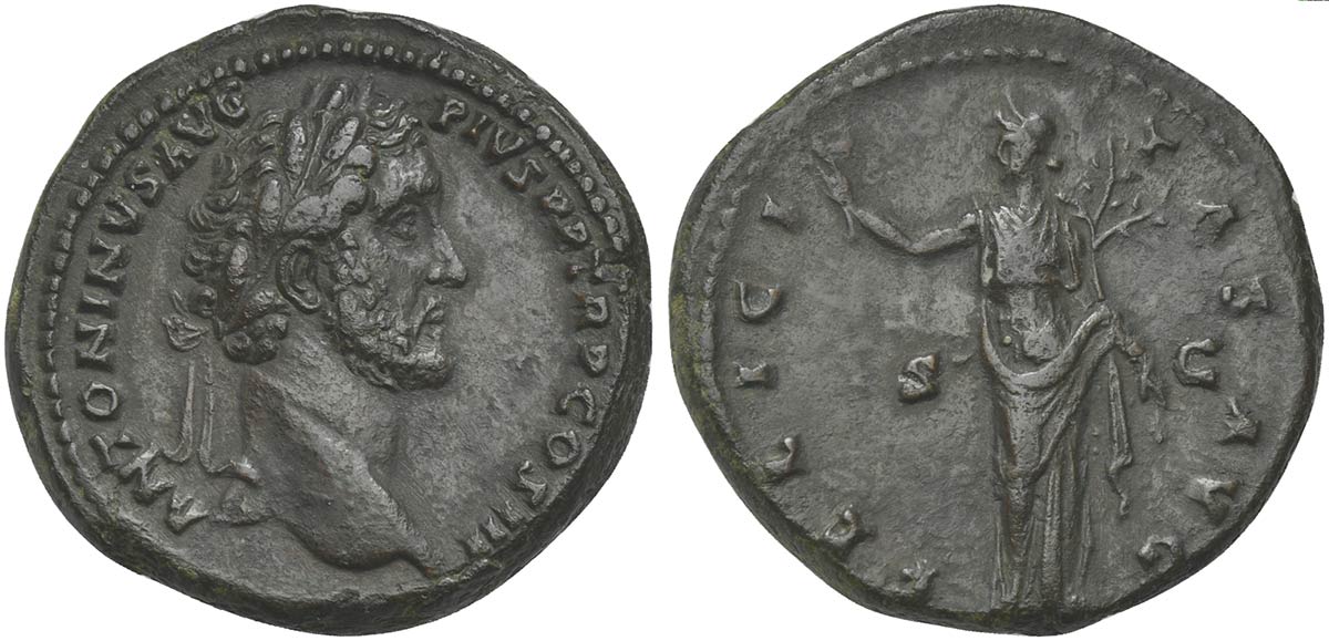 Antoninus Pius (138-161), As, Rome, 140-4. AE (g 13.22, mm 28, h 6). ANTONINVS PIVS P P TR P COS III, Laureate head r.; Rv. FELICITAS AVG / S - C, Felicitas standing l., holding caduceus and branch. RIC 679. Good very fine