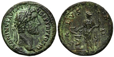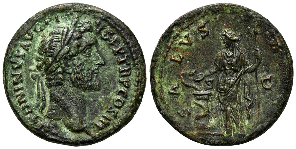 Antoninus Pius (138-161), As, Rome, 140-4. AE (g 10,39; mm 27; h 12). ANTONINVS AVG PIVS P P TR P COS III, Laureate head r.; Rv. SALVS A[VG], Salus standing facing, head l., feeding serpent entwined around altar from patera and holding rudder set on globe, S - C. RIC 688b. Green patina, very fine - good very fine