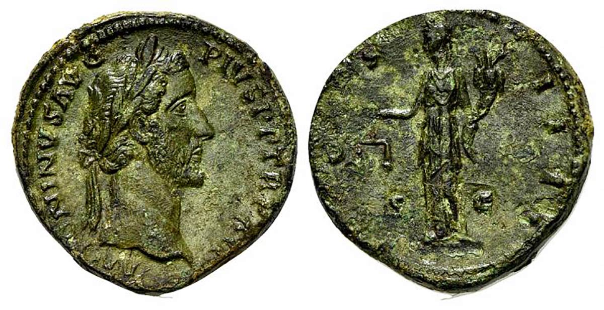 Antoninus Pius (138-161), Sestertius, Rome, 148-9. AE (g 23,78; mm 32; h 12). ANTONINVS AVG PIVS P P TR P XII, Laureate head r.; Rv. COS IIII, Aequitas standing l., holding scales and cornucopia. RIC 855. Green patina, some tooling, rough surfaces, near very fine