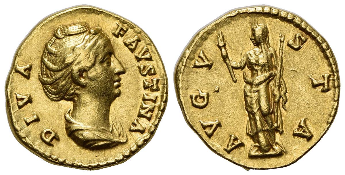 Diva Faustina Senior (died AD 140/1), Aureus, Rome, ca. 146-161. AV (g 6.92; mm 18; h 6). DIVA FAVSTINA, Draped bust r., wearing hair bound in pearls; Rv. AVGVSTA, Ceres, veiled, standing l., holding torch in r. hand and sceptre w