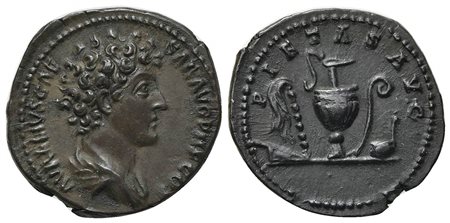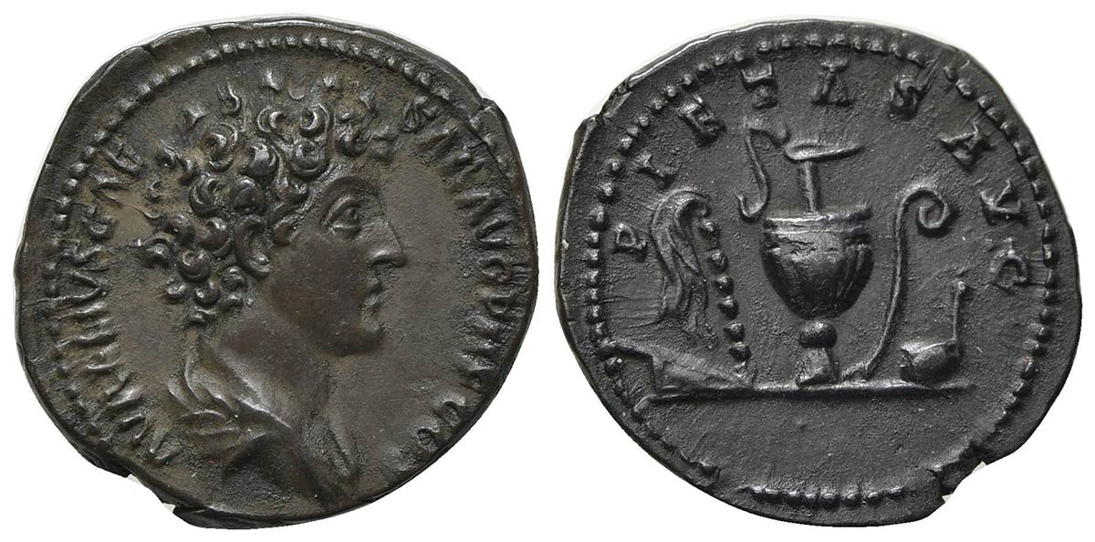 Marcus Aurelius (Caesar, 139-161), Denarius, Rome, 140-4. AR (g 3,21; mm 18; h 12). AVRELIVS CAESAR AVG PII F COS, Bare-headed and draped bust r.; Rv. PIETAS AVG, Emblems of priesthood: secespita, aspergillum, capis, lituus, and s