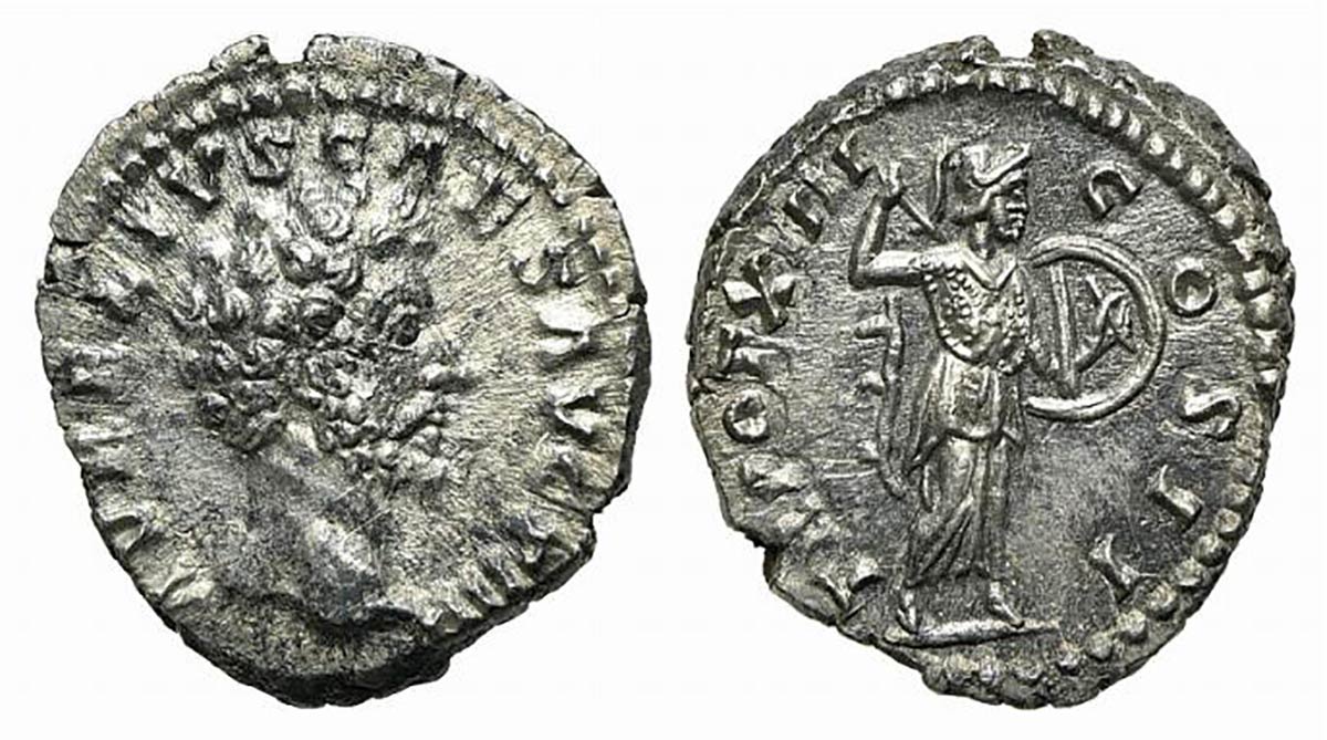 Marcus Aurelius (Caesar, 139-161), Denarius, Rome, 159-160. AR (g 3,28; mm 17; h 12). AVRELIVS CAES AVG PII F, Bare head r.; Rv. TR POT XIIII COS II, Minerva advancing r., holding spear and shield. RIC 483 (Pius); RSC 762. Dark patina, good very fine