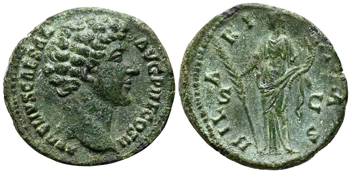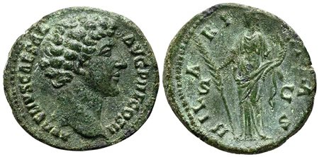 Marcus Aurelius (Caesar, 139-161), As, Rome, AD 145. AE (g 9,37; mm 26; h 12). AVRELIVS CAESAR AVG PII F COS II, Bare head r.; Rv. HILARITAS, Hilaritas standing facing, head l., holding palm frond and cornucopia, S - C. RIC 1260 (Pius). Green patina, good very fine