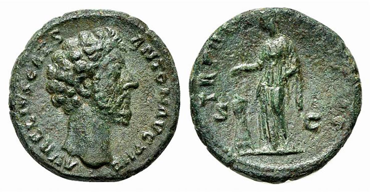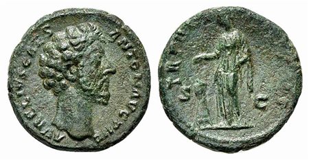 Marcus Aurelius (Caesar, 139-161), As, Rome, AD 156. AE (g 11,04; mm 25; h 5). AVRELIVS CAES ANTON AVG PII F, Bare head r.; Rv. TR POT X COS II, Pietas standing l., dropping incense onto lighted altar, S - C. RIC 1333. Green patina, near very fine