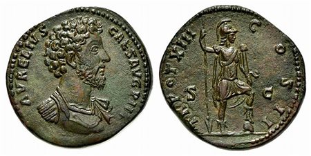 Marcus Aurelius (Caesar, 139-161), Sestertius, Rome, 158-9. AE (g 25,03; mm 32; h 12). AVRELIVS CAES AVG PII F, Bare-headed, draped and cuirassed bust r.; Rv. TR POT XIII COS II, Virtus standing r., holding spear and parazonium, l