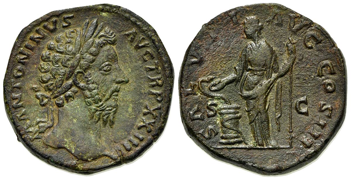 Marcus Aurelius (161-180), Sestertius, Rome, AD 169. AE (g 25,71; mm 31; h 6). M ANTONINVS AVG TR P XXIII, Laureate bust r., with slight drapery; Rv. SALVTI AVG COS III, Salus standing l., feeding serpent entwined about altar from