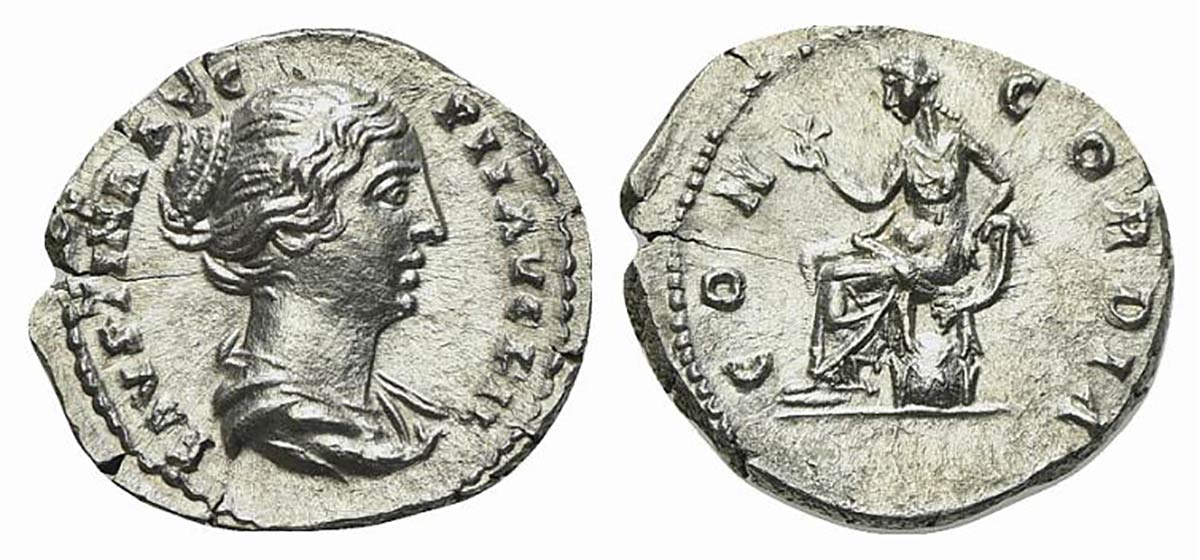 Faustina Junior (Augusta, 147-175), Denarius, Rome, 152-3. AR (g 2,97; mm 19,5; h 6). FAVSTINA AVG PII AVG FIL, Draped bust r.; Rv. CO-CORDIA, Concordia seated l., holding flower and resting l. elbow on cornucopia; globe below thr