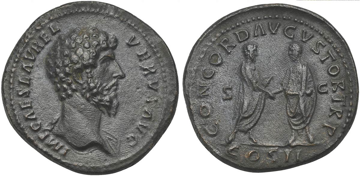 Lucius Verus (161-169), Sestertius, Rome, AD 161. AE (g 24,20; mm 34; h 11). IMP CAES AVREL VERVS AVG, Bare-headed bust r., slight drapery on l. shoulder, Rv. CONCORD AVGVSTOR TR P COS II, Aurelius and Verus standing vis-à-vis, clasping r. hands. RIC 1283 (Aurelius). Good very fine