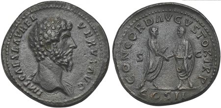 Lucius Verus (161-169), Sestertius, Rome, AD 161. AE (g 24,20; mm 34; h 11). IMP CAES AVREL VERVS AVG, Bare-headed bust r., slight drapery on l. shoulder, Rv. CONCORD AVGVSTOR TR P COS II, Aurelius and Verus standing vis-à-vis, cl