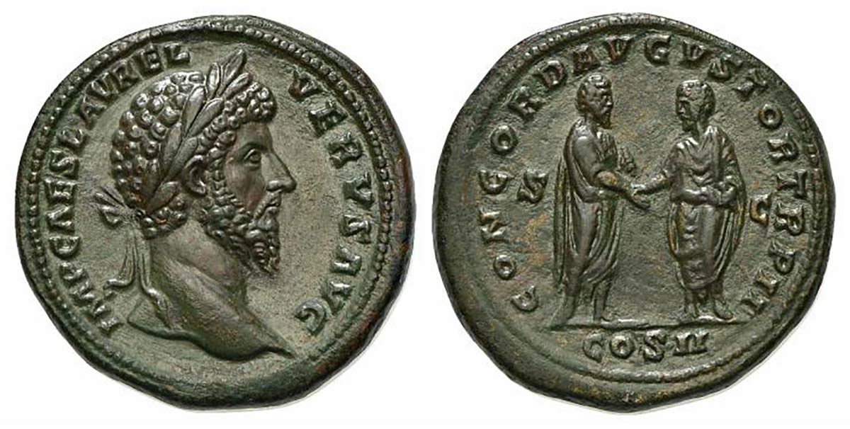 Lucius Verus (161-169), Sestertius, Rome, AD 162. AE (g 28,84; mm 34,5; h 12). IMP CAES L AVREL VERVS AVG, Laureate head r.; Rv. CONCORD AVGVSTOR TR P II / COS II, Lucius Verus and Marcus Aurelius standing vis-à-vis, clasping r. h