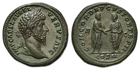 Lucius Verus (161-169), Sestertius, Rome, AD 162. AE (g 28,84; mm 34,5; h 12). IMP CAES L AVREL VERVS AVG, Laureate head r.; Rv. CONCORD AVGVSTOR TR P II / COS II, Lucius Verus and Marcus Aurelius standing vis-à-vis, clasping r. hands, S - C. RIC 1308 (Aurelius). Good very fine