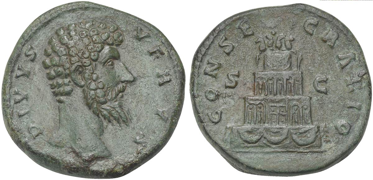 Divus Lucius Verus (died AD 169), Sestertius, Rome, AD 169. AE (g 25,61; mm 32; h 11). DIVVS VERVS, Bare head r., Rv. CONSECRATIO, Four-tiered funeral pyre, decorated with garlands and surmounted by quadriga. RIC 1511 (Marcus Aurelius). Good very fine