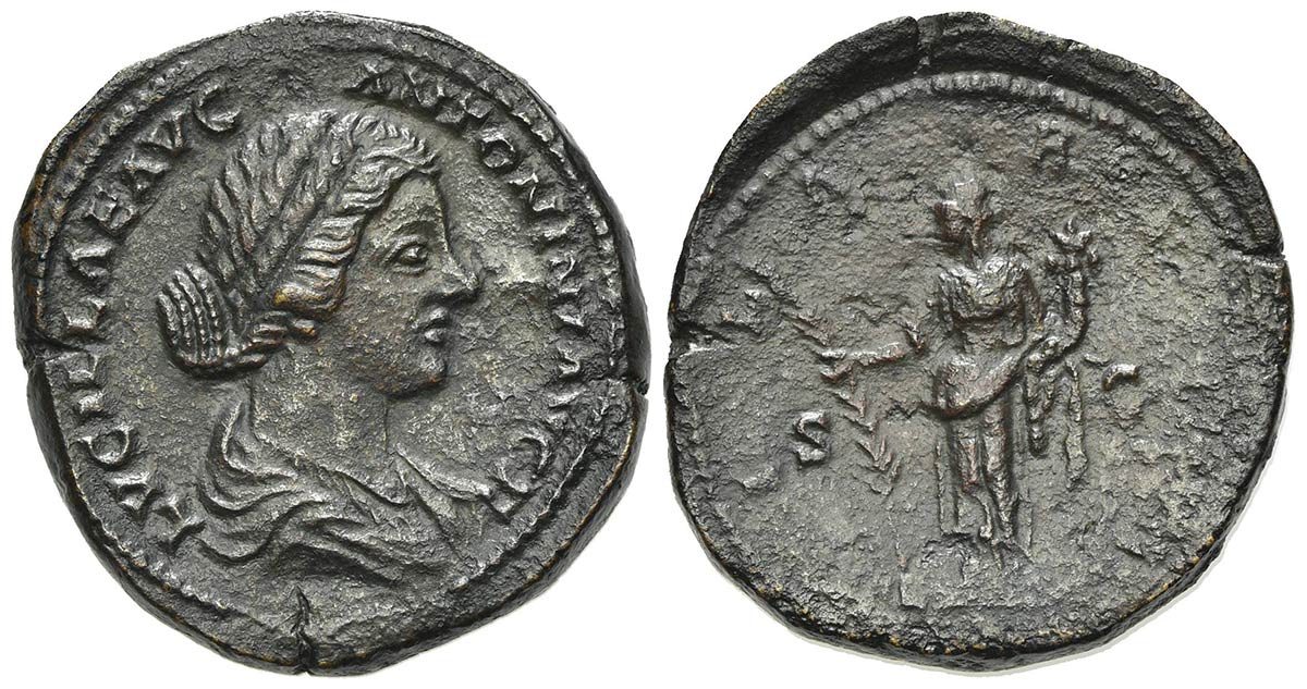 Lucilla (Augusta, 164-182), Sestertius, Rome, 164-7. AE (g 27,26; mm 33; h 6). LVCILLAE AVG ANTONINI AVG F, Draped bust r.; Rv. HILARITAS, Hilaritas standing l., holding long palm frond and cornucopia, S - C. RIC 1742 (Aurelius). Roughness on rev., very fine
