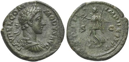 Commodus (177-192), As, Rome, AD 178. AE (g 10,12; mm 27; h 12). L AVREL COMMODVS AVG, Laureate and cuirassed bust r., Rv. TR P III IMP II COS P P, Victory advancing l., holding wreath and palm branch in field, S - C. RIC 1596 (Au