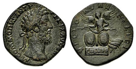 Commodus (177-192), Sestertius, Rome, AD 189. AE (g 22,17; mm 30; h 6). M COMMODVS ANT P FELIX AVG BRIT, Laureate head r.; Rv. VICTORIAE FELICI, Victory flying l., holding open wreath over two shields which are set on a basis insc