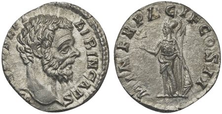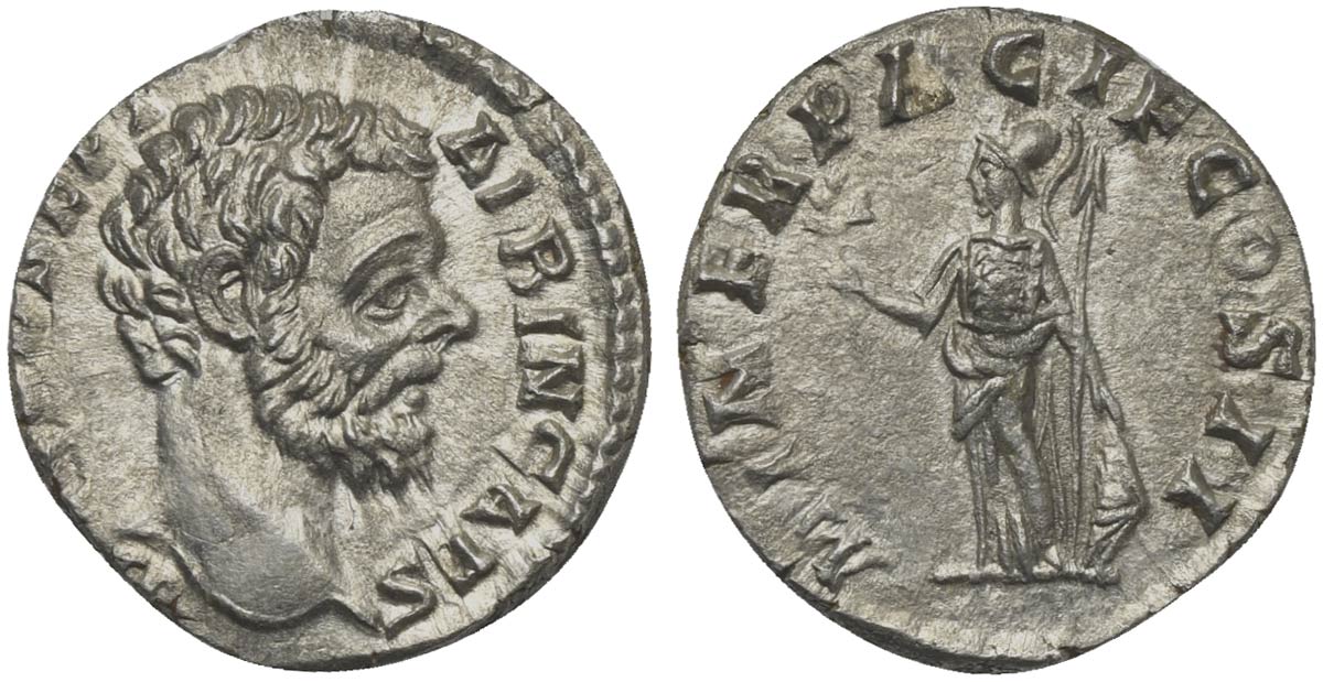 Clodius Albinus (Caesar, 193-195), Denarius, Rome, 194-5. AR (g 2,68; mm 18; h 12). D CL SEPT ALBIN CAES, Bare head r., Rv. MINER PACIF COS II, Minerva standing l., holding olive branch and shield set on ground; spear against l. arm. RIC 7; RSC 48. Near extremely fine