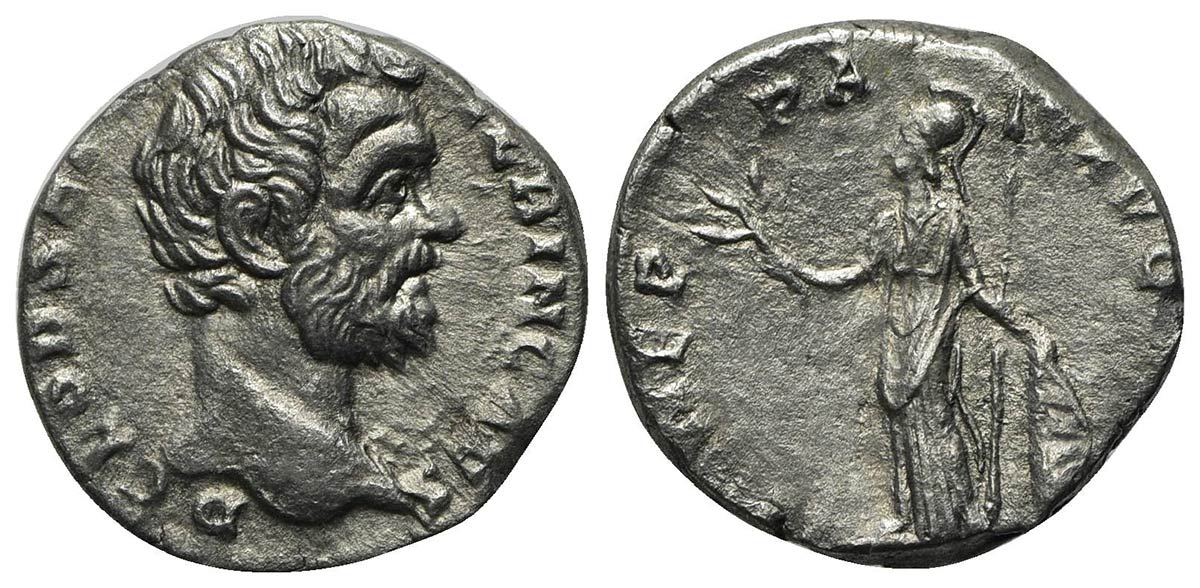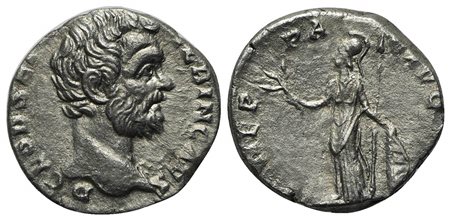 Clodius Albinus (Caesar, 193-195), Denarius, Rome, 194-5. AR (g 3,28; mm 16; h 6). D CL SEPT ALBIN CAES, Bare head r., Rv. MINER PACIF COS II, Minerva standing l., holding olive branch and shield set on ground; spear against l. arm. RIC 7; RSC 48. Good very fine