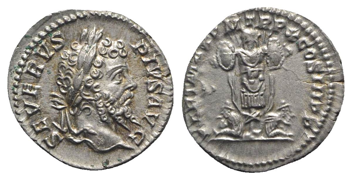 Septimius Severus (193-211), Denarius, Rome, AD 202. AR (g 3,38; mm 18; h 6). SEVERVS PIVS AVG, Laureate bust r.; Rv. PART MAX P M TR P X COS III P P, Trophy between two seated captives. RIC 185; RSC 373. Toned, near extremely fin