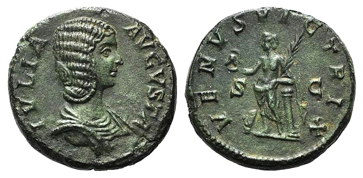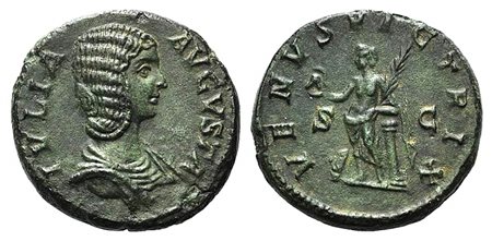 Julia Domna (Augusta, 193-217), As, Rome, ca. 207-211. AE (g 10.50, mm 25, h 6). IVLIA AVGVSTA, Draped bust r.; Rv. VENVS VICTRIX / S - C, Venus standing l., leaning on short column, holding helmet and palm; shield at feet. RIC 890 (Septimius). Green patina, near extremely fine