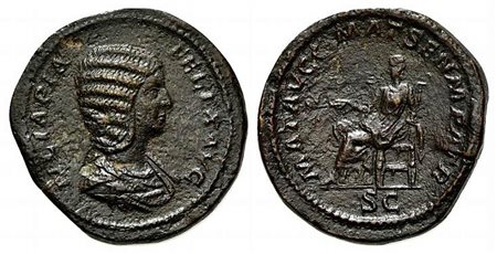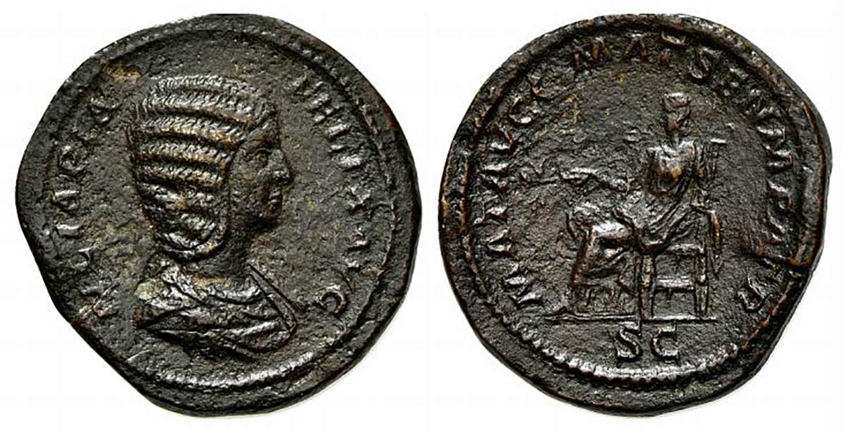 Julia Domna (Augusta, 193-217), Sestertius, Rome, 211-5. AE (g 26,28; mm 34; h 12). IVLIA PIA FELIX AVG, Draped bust r.; Rv. MAT AVGG MAT SEN M PATR, Julia Domna (as Pax) seated l., holding olive branch and sceptre. RIC 588 (Carac